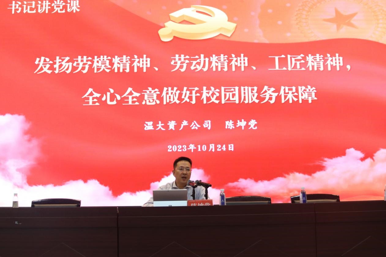 按照學(xué)習(xí)貫徹習(xí)近平新時(shí)代中國(guó)特色社會(huì)主義思想主題教育“學(xué)思想、強(qiáng)黨性、重實(shí)踐、建新功”的總要求,落實(shí)溫州大學(xué)關(guān)于縣處級(jí)干部“百堂黨課下基層”活動(dòng),全面提升公司黨員黨性修養(yǎng),團(tuán)結(jié)職工奮進(jìn)力量,資產(chǎn)公司黨總支于10月24日在南校區(qū)9號(hào)樓報(bào)告廳,公司黨總支書記陳坤黨面向全體職工開(kāi)展了主題教育書記黨課,主題是“發(fā)揚(yáng)勞模精神、勞動(dòng)精神、工匠精神,全心全意做好校園服務(wù)保障”。