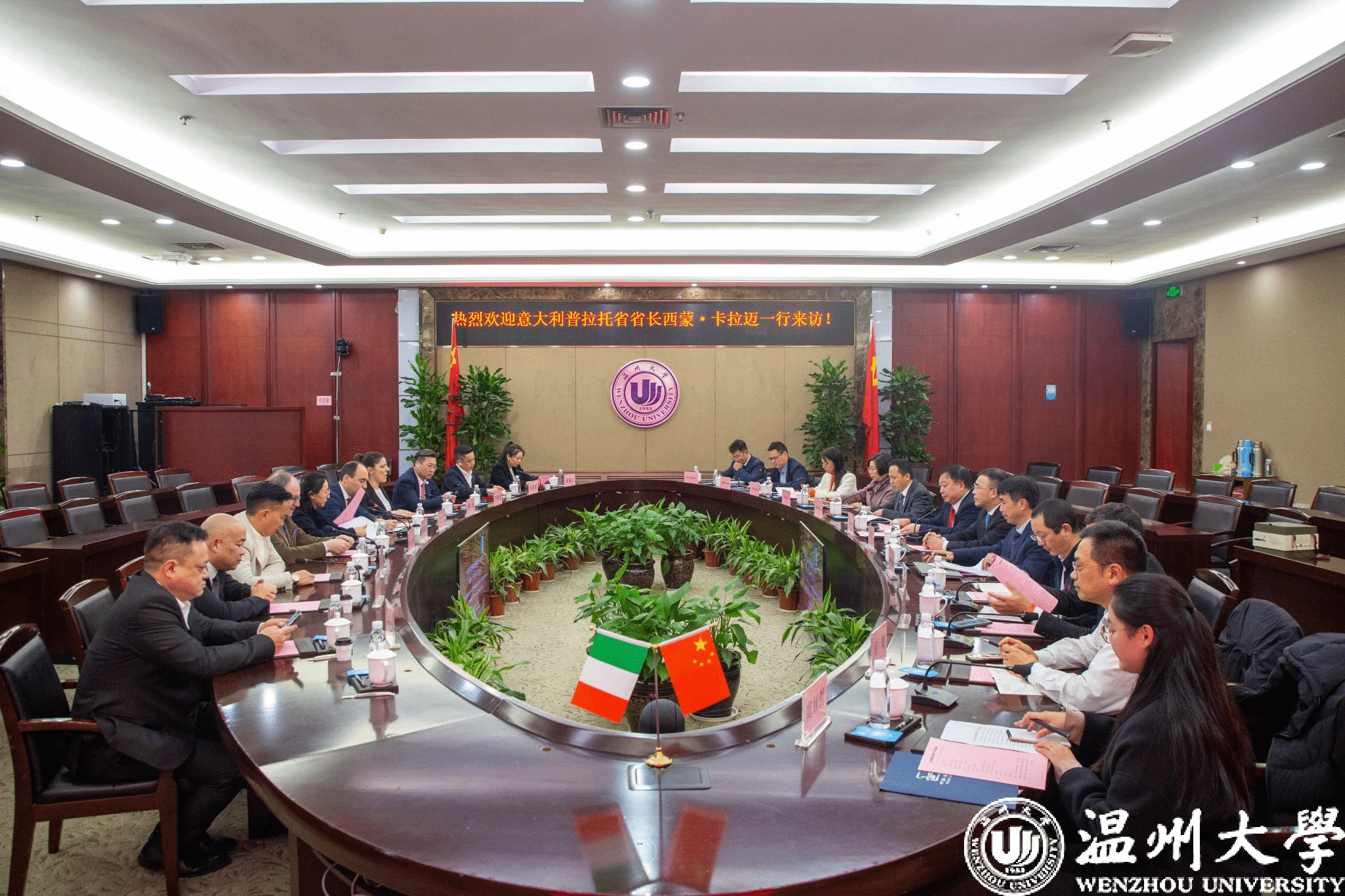 On March 11th, Simone Calamai, President of Prato Province, Italy, led a delegation to visit our university for discussions and exchanges. President ZHAO Min and Director ZHOU Junwu of the Foreign Affairs Office of Wenzhou Municipal People’s Government attended the meeting. Vice President WANG Shun presided over the event.